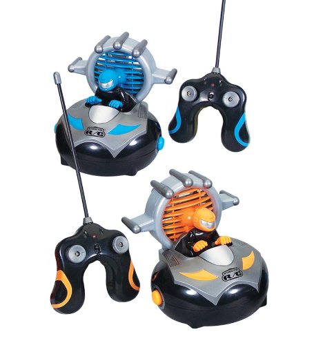 Get ready to send your opponent flying with the Bump 'n' Chuck RC Bumper Cars from Kid Galaxy. These futuristic bumper cars race around each other with remote control technology, and when they collide, drivers are ejected right out of their seats. Prepare yourself for a fierce competition between team orange and team blue! Set includes two remotes, two cars, and two drivers. Cars are fully functional. Requires 10 "AAA" batteries, not included. Read moreReview Rating :
